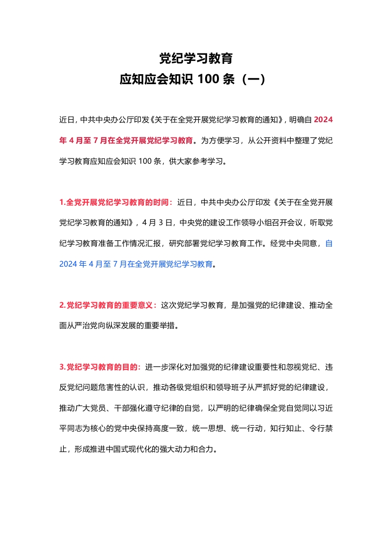 红色简洁党纪学习教育应知应会知识100条(一)党员干部学习(WORD讲稿讲稿)