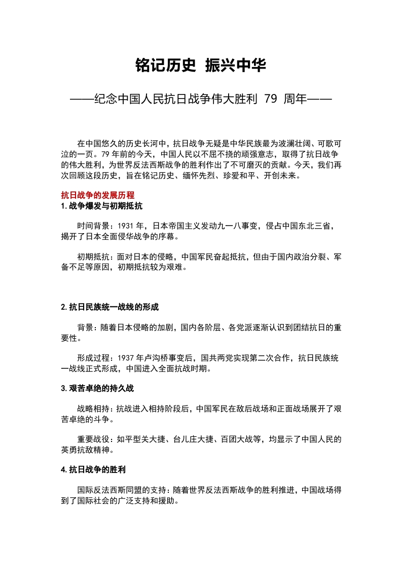 2024铭记历史振兴中华纪念中国人民抗日战争伟大胜利 79 周年党课(讲稿)