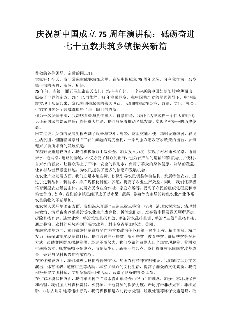 庆祝新中国成立75周年演讲稿:砥砺奋进七十五载共筑乡镇振兴新篇