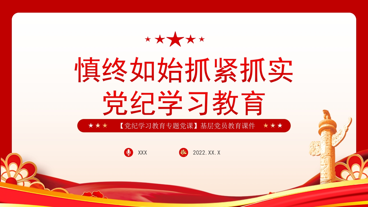 首页PPT课件模板PPT课件模板学习慎终如始抓紧抓实党纪学习教育党员干部培训党课ppt模板