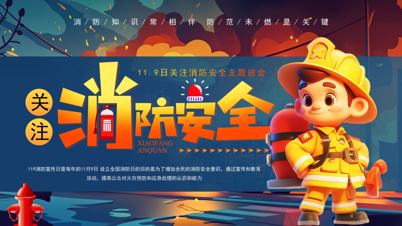 卡通119消防宣传日关注消防安全主题班会课件ppt模板