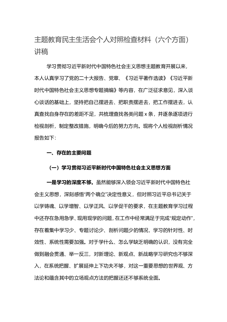 主题教育民主生活会个人对照检查材料(六个方面)讲稿