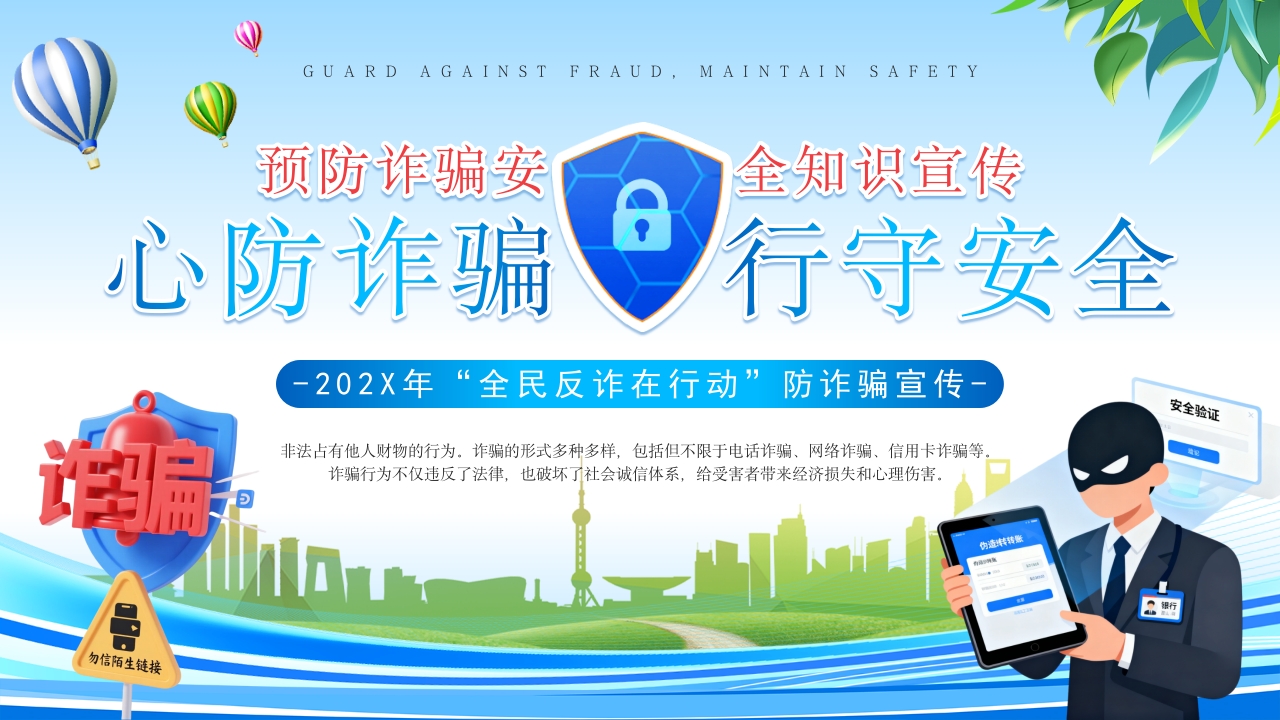 蓝色简约风心防诈骗行守安全防诈骗宣传辅导教育PPT模板